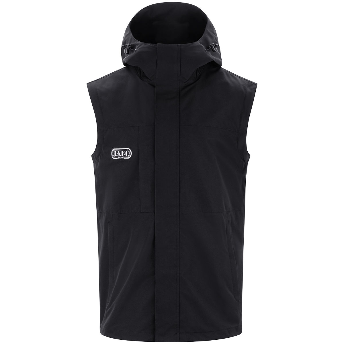 JAKO Retro Logo aus dem Jahr 1992. Wind- und wasserabweisendes Obermaterial mit Membran. Innenfutter aus Mesh mit offenem Abschluss im Rücken. Belüftungsöffnung am Rücken. Kapuze mit Kordelzug und Stoppern. Extra hoher Kragen. Ärmelabschluss mit Druckknopf. Abnehmbare Ärmel. Seitentaschen mit Reissverschluss. Innentasche. Getapte Nähte. JAKO Logo in Kontrast